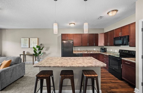The unit is spacious but you'll find all the accommodations of home. As you enter the front door, you're greeted by the large and expansive kitchen, stocked with all the basic appliances you would need (toaster, Keurig, microwave, etc) as well as bakeware, kitchen gadgets, etc. as well as plenty of seating! If you're bringing a little one, you'll find a high-chair as well.