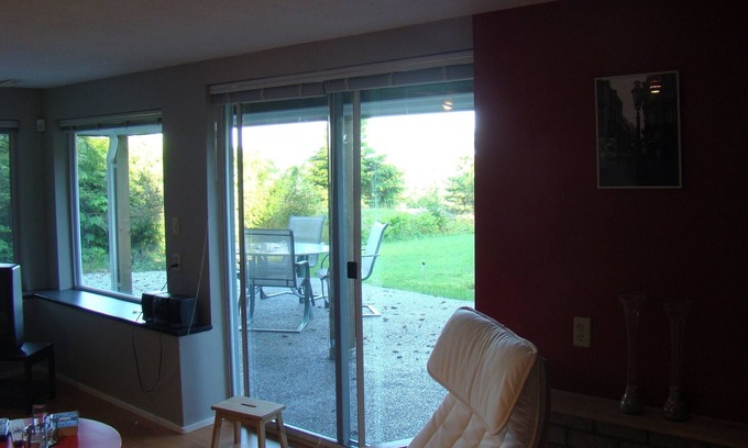 Private entrance, private driveway, fully-equiped; sleeps 2-3; one bedroom (Queen-size bed), one new bathroom (shower), open kitchenette (stove, fridge, microwave, etc pots and pans, coffee maker, dinnerware, cutlery), patio with patio-set and cushions, garden bench, barbeque, gas fireplace in living room, internet, Wi-Fi; cable TV; sleeper couch; W/D shared. Walk-out to private yard; southern exposure; near creek and green-belt; one hiking trail entrance within 250 meters.