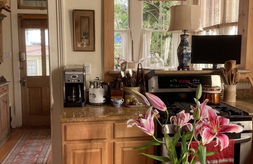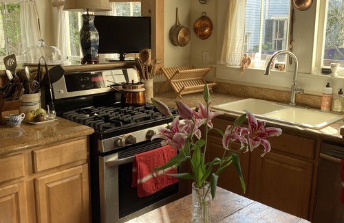 The kitchen is fully stocked, has Cuisinart stainless steel cookware, and there is a library of cookbooks, local authors & children’s books as well as board games for both children & adults. There is a bar in the living room with vintage cocktail glasses & liquor & wine decanters.