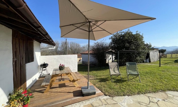 Spacious gîte on the first floor of the owners' house (access by an outside staircase) in a district located 4 km from the listed village of Sare. Equipped kitchen area (microwave, induction hob, fridge-freezer, dishwasher), living room (wood stove), lounge area, 2 bedrooms (1 double bed, 2 single beds), shower room (washing -linen), wc. Cellar. Private terrace with garden furniture, barbecue and 2 deck chairs. Small field. Oil heating included. Wood provided. Beds made on arrival, towels included. Wifi internet connection. Many hiking trails from the cottage. Caves of Sare, animal park, Spanish border nearby.