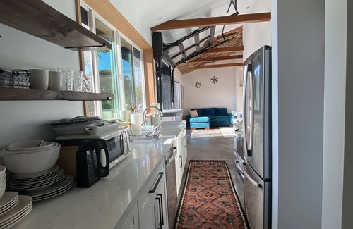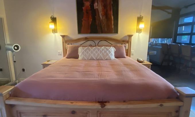 This gorgeous large room-studio has vaulted ceilings, hand crafted, with wine barrel staves. This spacious studio has all the upscale amenities one could ever desire... Amazing Lake view, gas fireplace, 70-inch TV, indoor-outdoor bar, with electric garage door-window, accordion 3 door sliders that completely open onto a large deck. The lake has all kinds of wildlife... geese, ducks, birds, egrets, cranes, frogs, deer, fox, etc… The kitchen is fully equipped, with high end appliances and cookware. Everything is brand new! There is a Speed-Queen washer and dryer. The marble bathroom floors & shower floors are heated. The shower has vaulted ceilings with a huge skylight. The toilet includes a remote with bidet features and a heated seat. The property has a custom barn with mules and goats, 2 vineyards, a kidney shaped pool, your deck has a spacious 8–10-person spa. Take a walk around the lake and property, to see the vegetable and herb garden, sample the grapes and meet the animals. We are also just a short walk to the local bar, restaurant and market. Enjoy the gas fire pit, on the deck, above the pool area. There is a grill at the pool area and also on your deck, right outside your sliders, to the right. Please come and enjoy this little slice of heaven.