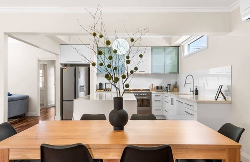 This home has three spacious bedrooms all with queen-size beds and ample storage. These light-filled rooms have some beautiful original finishings with all the modern touches you need for a comfortable stay. Walk through this home and you'll fall in love with the high ceilings, wooden floorboards and tasteful furnishings. The kitchen is fully-equipped with all the appliances and cookware items should you like to cook up a storm and the dining space has enough seating for all guests. This room also has a dedicated workspace making this the ideal home for workers and students alike.