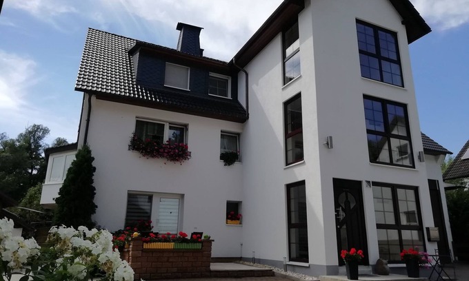 The property is easily accessible via Paderborn Lippstadt Airport (80 km) and includes free parking, WiFi, and a fully equipped kitchen.