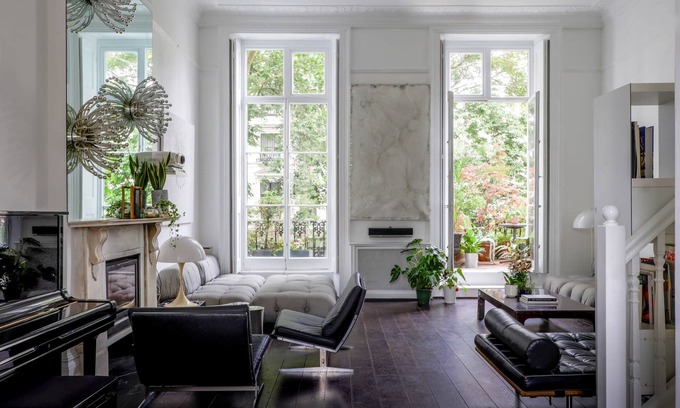 The original Georgian stucco is beautifully complemented by elegant continental European design elements from the late '60s, as well as works from contemporary artists and designers who are personal friends of the owner. Notably, the apartment also boasts eco-friendly features that reflect the owner's commitment to sustainability.