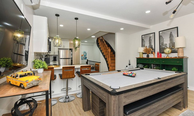 As you step into the open-concept living area, you'll be greeted by the stylish, contemporary design, with a spacious layout ideal for both relaxation and entertainment. The living room is equipped with a pool table, making it the perfect place to unwind after a busy day of exploring the city or to enjoy a friendly game with your group.