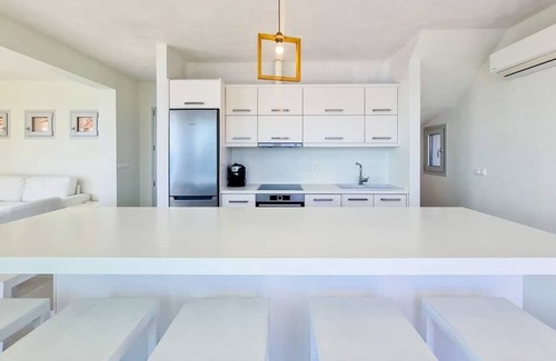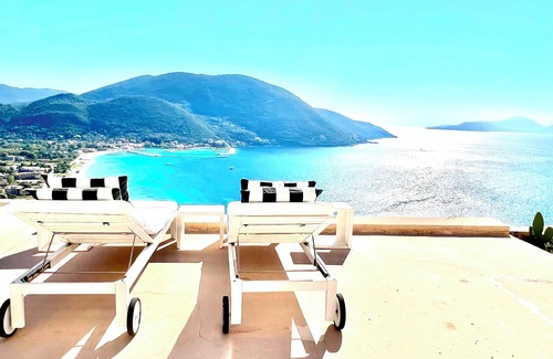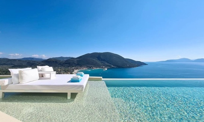 This well equipped independent villa provides 3 bedrooms and 3 bathrooms and all the facilities a family may need ,suitable for up to 7people. The huge balconies are absolutely private with a breathtaking view. For your wellness, the villa boasts a private pool. The villa is located among olive trees and above the fisherman's village Vasiliki, also well known for its perfect windsurfing conditions. The deep water is also ideal for children