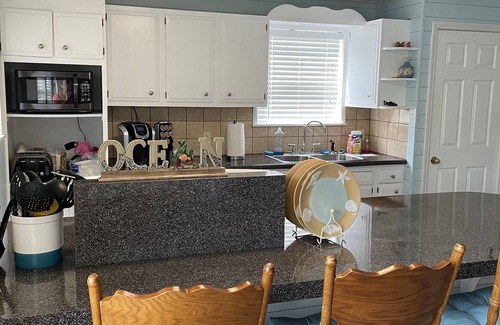 This warm, comfortable home has a large living room with an open concept The kitchen is great for family get togethers. It is equipped with an electric stove, microwave and many essentials for creating a great meal. If you decide to cook outdoors, just let Norma know and she will provide a grill for the backyard.