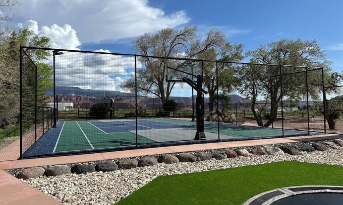Near Capitol Reef National Park and many natural wonders. Private sport court (pickle ball, full court basketball, volleyball, tennis, four square, hopscotch), scooter paths, in-ground trampoline, bicycles, crystal clear air, and blue skies. Roast S'mores at the firepit and play 9 square in the air. Stargaze at the certified dark sky. 6 bedrooms, 3.5 baths, sleeps 21 in beds with 5 additional comfy sleeping pads. Fully equipped kitchen. Perfect for hosting families, retreats, reunions, and getaways.