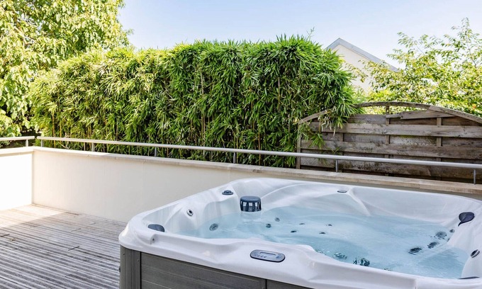 Large garden with trees and terrace at the back, access to the heated spa at an additional cost (€180 per stay).