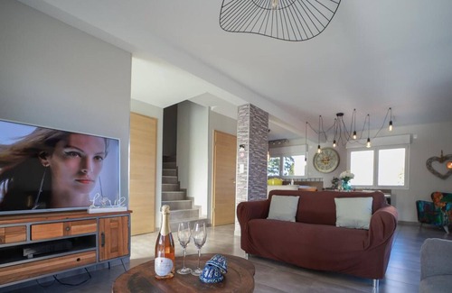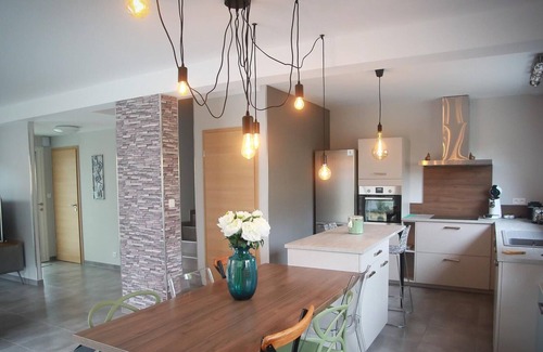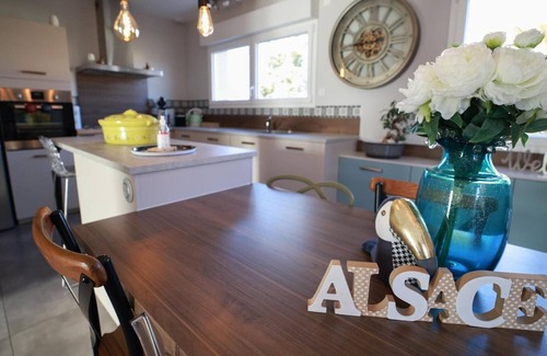 Sylvie and Philippe welcome you to this modern house in the heart of a charming village in Alsace halfway between Colmar and Mulhouse. You will stay in peace in the Alsatian plain, bordered by the Rhine to the east and the Vosges to the west. The house, built in 2020, can accommodate up to 6 people, it has a garden with terrace and a carport. Inside, the ground floor is a large living room of 45m², including: a fully equipped kitchen (oven, extractor, dishwasher and kitchen appliances, SENSEO coffee maker and filter coffee maker etc ...), a living room that can comfortably accommodate 6 people and the living room. Separate toilets and a storage room are also accessible on this level. Upstairs, the sleeping area with 3 bedrooms (sheets are included in your rental), all the beds can be separated or assembled as needed: (on request at least 1 week before your arrival) bedroom 1: 180*200cm bed and storage. bedroom 2: 160*200cm bed and storage. bedroom 3: 2 beds of 80*200cm and storage, The bedding has been chosen with care in a specialized store for your comfort. A bathroom with shower, sink and WC complete this level. The cottage has WIFI by fiber optic, you will also have all the useful equipment for your stay including a washing machine, conviviality appliances (barbecue, raclette, fondue), a relaxation area on the terrace. Car park Your cottage is located about 20 km from Colmar, 16 km from Mulhouse, 5 km from the Parc du Petit Prince and the Alsace Ecomuseum in Ungersheim, two must-sees in the department to do with the family. And finally about 75 km from Europa Park for a day trip. In the village you will find all the amenities: bakery, butcher, supermarket, tobacconist, hairdresser, doctor, pharmacy, bank. In Ensisheim, a town about 4 km away, you have several restaurants and pizzeria service with home delivery. A second detached house, Maison Nicole a few meters away is available with the same configuration, depending on availability you can rent them at the same time in order to double the capacity in person, [hidden] up to 12 people. Optional services to be paid on site and to be reserved before your arrival: - End of stay cleaning: 99.56€ per stay Property managed by a professional. Unless stated, services such as cleaning, bed linen, towels etc. are not included in the price of this rental. If pets are allowed (information in the advertisement), charges may be applicable. Only equipment mentioned in this advertisement are present. Equipment not mentioned are not considered to be present.
