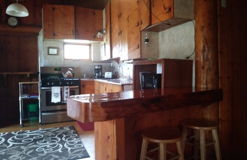 This cabin has a fully-equipped kitchen, 3 queen size beds, 1 single bed, and 1 indoor bathroom with toilet, sink, and lots of hot water for the tub and shower.