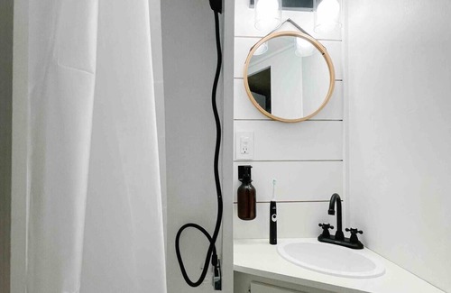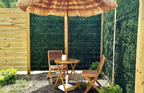 Inside, you’ll find cozy, Insta-worthy décor, a fully equipped kitchenette, & all the comforts of home. Outside, enjoy your privately fenced in patio with string lights, a fire pit, outdoor shower, and private parking area.