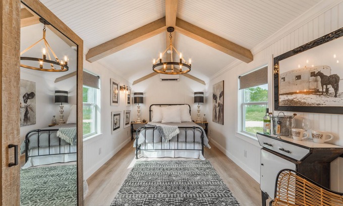 "The Sonnie" is one of 4 uniquely decorated cabins at Green Acres Spicewood. It has a farmhouse feel with gray and white colors. Black and white artwork of animals compliment this vintage trailer and its rustic coffee bar and accessories transports you back to simpler, slow-paced times. A Queen bed, mini fridge, coffee maker, a bottle of wine, snacks, and more await guests who come to relax and unwind in The Sonnie.