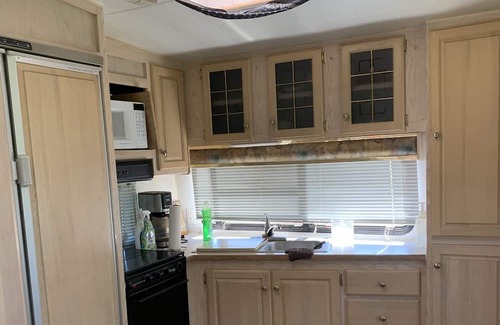 This is the best of all summer vacations. Enjoy the sunniest spot in Alberta and the country! Relax in peaceful country country living, creek side. Animals and wildlife will be your neighbors in this special spot. Enjoy “ Goldie” a former trailer park resident, well kept by granny, this spacious 5th wheel boasts 2 slides a huge master bedroom with queen bed, walk in grand closets, large full bathroom and kitchen, even a laundry machine if you so need.