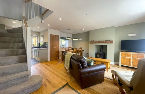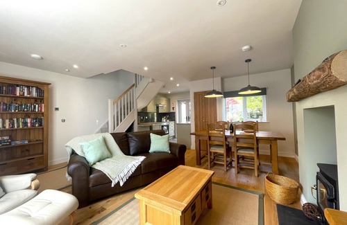 Entering the cottage from the porch, the spacious open-plan lounge/kitchen/diner provides a charming sociable living space for unwinding after a day of adventures. There are two comfortable leather sofas to curl up on in front of the cosy log-burning stove while you enjoy your favourite series on the Smart TV or a good book.