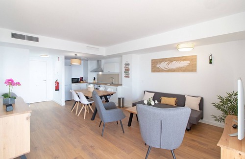 The apartment has two bedrooms, two bathrooms, a kitchen open to the living room, a large terrace with incredible views of the Mediterranean coast, and air conditioning. It is perfect for up to five people. In addition, if you have a pet, you can bring it because the accommodation are pet-friendly. It also has a garage located in the same building.