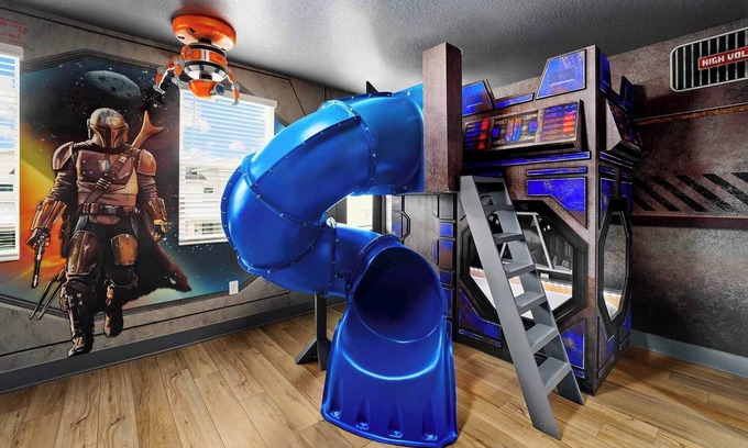(4 twins; 2 fulls) Embark on an interstellar adventure in this extraordinary ‘Starship’ themed bedroom, built for budding astronauts and adventurers! Past the front door, you’ll find yourself inside a spaceship, complete with three cozy bunk beds surrounded by “windows” that peer into outer space: a mesmerizing deep blue canvas with galaxies and twinkling stars. Decorative elements adorning the wall art and the facades of the bunk beds resemble real spaceship controls–including buttons, levers, and neon lights. And a vibrant blue twisty slide effortlessly transports intrepid explorers from the top bunk to the ground below, simulating a journey through space!