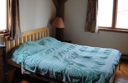 The first floor has a fully equipped kitchen -- dish washer, microwave, toaster oven, etc. -- with a counter that opens into the dining room. The dining room opens into the living room, both of which have floor-to-ceiling windows looking over the woods and miles of wooded hills and on over the Hudson River Valley, with not a house in sight! The dining room opens onto the wrap-around deck. Also on the first floor is a half-bath and a den with a pull-out couch.