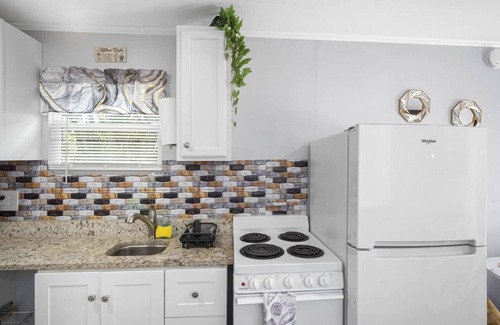 This charming tiny home is a peaceful retreat, perfect for a couple or a small family of up to 3 guests. It features 1 bedroom, 1 bathroom, and a sofa bed for an extra guest. The kitchen is fully equipped for all your cooking needs, and a washer and dryer are included for added convenience. Enjoy a sunny outdoor space with comfortable seating, surrounded by beautiful greenery—ideal for relaxing, reading, or soaking in the fresh air.