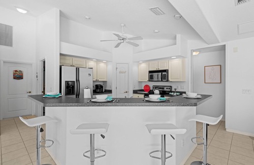 The large open kitchen is equipped with all you need to make a gourmet meal, a breakfast bar that sits 4 along with additional space with an elegant table, and 4 chairs overlooking the sparkling pool and lanai area. The kitchen has a beautiful island with white bar stools, lots of countertops, plenty of storage, pantry, and stainless-steel appliances.