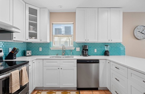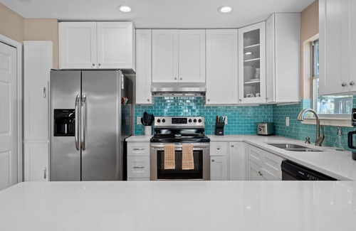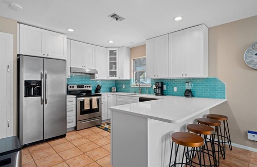 The beautifully updated Gone Coastal kitchen features brand-new white cabinets, stainless-steel appliances, and sprawling granite countertops make cooking in this kitchen pure delight. You have everything you need from cookware to serving ware and utensils on hand. If you're not dining outdoors on the patio (there's room for six!), you can gather your group around the dining room table. The ingenious design of Gone Coastal creates an actual dining area while also keeping the space open and accessible to the flow of the home design. Every meal you serve in this dining room will feel special. The table seats up to six. If additional places are needed, you can seat up to four additional guests at the breakfast bar.