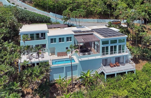 Gorgeous Caribbean paradise with 3 private bedrooms w/ ensuite bathrooms all luxuriously appointed and fully remodeled. Sprawling living and kitchen layout perfect for larger groups to get together and enjoy stunning ocean views with direct line of site over to White Bay in the BVI, Tortola, Hans Lollik and Mandahl Beach/Salt Pond. The villa is equipped with multiple patio areas that allow the trade-winds to blow through the property for comfortable outdoor living. Huge Pergola covering the main outdoor living space with outdoor dining table/chairs. Look directly out at the turquoise Caribbean water with multi-million dollar views through the palm trees and down at crashing waves and sailboats passing by. Grab our binoculars and view whales migrating during the winter months. Step into the pool equipped with color changing LED light and relax all day with a drink and a good book. The pool gets excellent morning sun keeping it warm throughout the day. Built in ledge allowing for sunbathing or reading/relaxing. Step up to the upper deck and enjoy the lounge chairs and let the stress melt away. House is fully stocked with everything you'll need for your stay including beach chairs, snorkel gear, beach bags, beach towels, regular high quality towels, linens, extra pillows, soaps/shampoo's and bathroom essentials. Kitchen is fully equipped w/ everything you'd expect including small appliances ( toaster, griddle, coffee maker, keurig w/ k cups, blender) pots/pans/bowls, cups, glasses, coffee mugs, cutlery, baking pans/sheets and a gourmet commercial gas range/oven. High Speed Internet/WIFI provided & SMART-TV's in each room with SLING cable service & equipped with Netflix, Amazon Prime, Hulu and more. House is equipped with Solar Panels and Tesla Battery Back Up system to maintain electrical service during any outages that could occur. High end 5 stage water purification onsite with Ultra Violet & reverse osmosis filtering. The Villa is gorgeously landscaped with flowering plants, palms, fruit trees, and tropical underbrush. Home is very private with no line of site views from any other homes for a truly secluded feel. Driveway is well lit with photo-eye lighted path and motion sensing LED lights at entrances. 7-10 minute drive to Magens Bay Beach which is one of the top 10 beaches in the world. 3 minute drive to Mandahl beach and Salt Pond which is like a natural pool the whole family will enjoy. Just a few minutes from shopping/dining and a great central location for touring the island. Be sure to rent a vehicle when you stay at any villa in St Thomas. If this property is booked or you have a larger group, we own and manage another gorgeous villa overlooking Magens Bay Beach w/ private pool. Check out our direct site at RNRVACAYS.COM. Come and be our guest at Good Vibes Only Caribbean Villa!