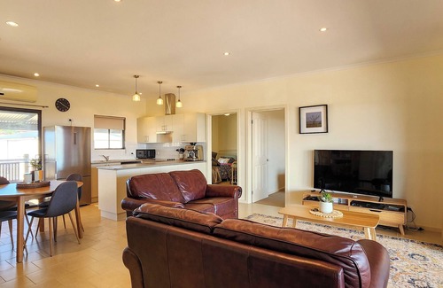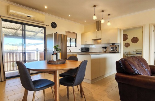 This holiday house features both modern and classy furnishings, split system A/C for year round comfort, three bedrooms, open plan bright living, TV, large family size fridge, washing machine, dryer & modern kitchen.