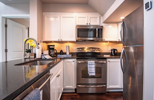 Our home has modern furnishings, a smart television in the living room and another television in the master bedroom upstairs. In this space, you will have 2 brand new king sized beds in each bedroom, 2 walk-in closets, 2 ensuite bathrooms, and a premium sleeper sofa (it is actually comfortable!) in the living room to add an extra sleeping option when needed. We also have a memory foam folding floor mattress and a half bath on the main floor. The kitchen is fully equipped to please any cook, and there is a washer/dryer in the condo for your convenience. Tall oversized windows throughout the condo provide plenty of natural light and a beautiful city view and partial water view. Our home also includes wireless internet and 2 large electric air conditioning units.