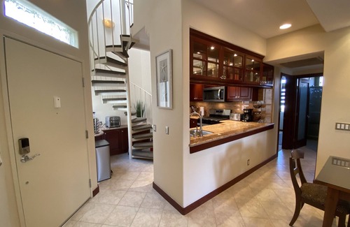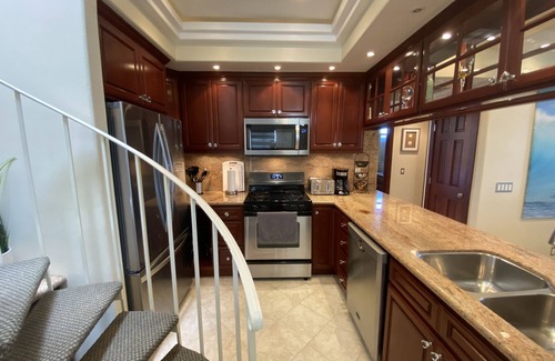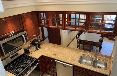 Your kitchen is loaded with gleaming granite countertopsand back-splash throughout, there is a newer large refrigerator with an icemaker, coffee maker, blender, toaster, spice rack, electric kettle, air fryer, pots, pans, silverware, glassware and dinnerware. All wood cabinetry, over the range microwave, custom lighted glass decorative cabinet gives a more open feel between the kitchen/dining and living areas. A clean Brita pitcher with one new and sealed filter is available as well as a dish drying rack/kitchen towels etc.