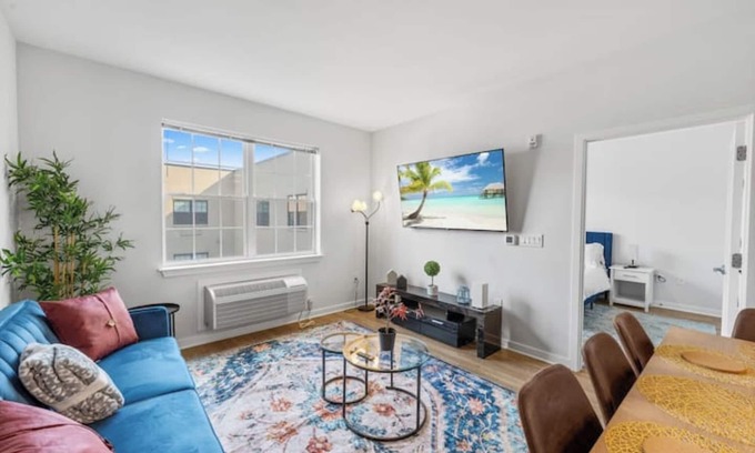 In Jersey City, you'll find your ideal place to stay. This cozy 2-bedroom apartment offers all the comforts you need for an unforgettable stay. Enjoy the convenience of high-speed WiFi and the ease of having a washing machine and dryer at your fingertips. Start your day refreshed with a hot shower in one of the 2 bathrooms, complete with towels and basic toiletries. Keep your wardrobe fresh with the iron and ironing board, and stay comfortable year-round with the air conditioning and heating. When you're ready to explore, the Prudential Center is just an 8-minute drive away, offering endless entertainment options. Unwind in the building's fitness room and equipment, or simply relax in the comfort of your home-away-from-home. This property has everything you need for a truly memorable vacation in Jersey City.