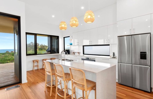 Upstairs the fully equipped kitchen boasts modern appliances and ample counter space, allowing you to prepare delicious meals during your stay. Enjoy your culinary creations at the dining table or the huge deck, where you can savor your feast while enjoying the mesmerizing ocean vistas.