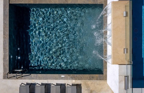 Outside, Villa Psínthos boasts a picturesque setting enveloped by a lush 12-acre olive grove and expansive balconies. Two infinity pools and a jetted tub connected by an impressive waterfall provide idyllic spots for relaxation. A modern BBQ grill invites guests to indulge in al fresco dining, while eight sun loungers, umbrellas, and a table with chairs offer ample space for poolside leisure. Enclosed by fences for privacy, the swimming pool is exclusively for guests' use. As dusk falls, guests can savor majestic sunsets and the enchanting sounds of nature, with complimentary private parking adding convenience. Villa Psínthos ensures an unforgettable luxury retreat in Rethymno, where tranquility and beauty grace every moment.