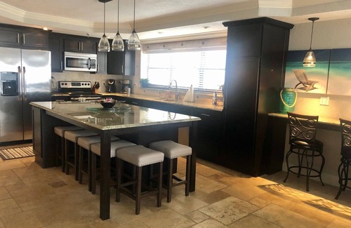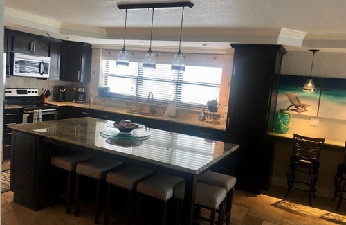 The living room provides a comfortable sectional and a large flat screen television equipped with cable for your favorite family shows. The kitchen is fully stocked and very spacious with a large island that is open to the family room with wrap around windows for ocean views. A washer and dryer is available in the unit for you convenience as well as high speed Wireless internet throughout to stay connected.