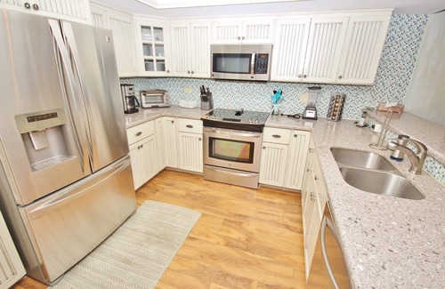 The fully stocked kitchen features white cabinets and plenty of counter space. It is fully equipped with a dishwasher, microwave, refrigerator and freezer, stove top with oven, as well as, cooking and eating utensils to create some delicious meals during your stay. The dining area has a dining room table and seating for six. After dinner, take a step out on the balcony and enjoy the peaceful sounds and view of the ocean. There is also a separate ice maker and mini fridge in the property. It's a really convenient way to pack a cooler for a day out on the beach!