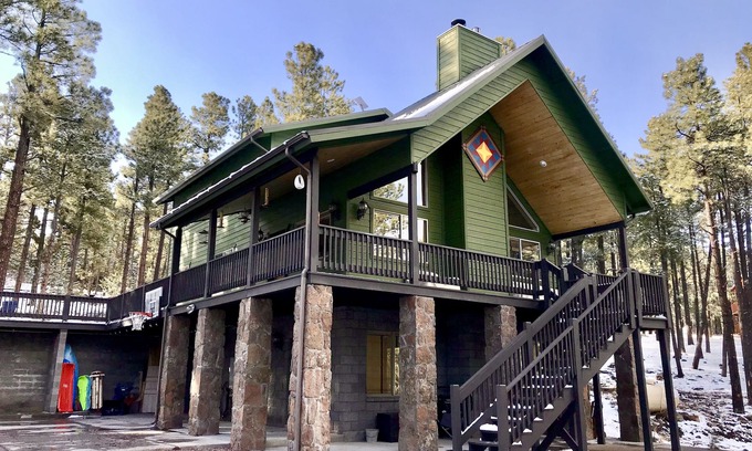 A bright airy 3-story cabin in the pines. There's room for all the family and friends with 3 bedrooms, 2.5 baths, loft and rec room each with sleeper sofas. A large patio with outdoor dining, lounge areas, fire basin, bbq hammock and hot tub. Heated garage features a pool table, foosball and darts. Outdoor basketball hoop and cornhole All the amenities included, washer/dryer, internet, TV's Nintendo Switch, board games, children's toys and a well stocked kitchen. Escape the valley and enjoy the best of the White Mountains in picturesque Greer. Sleds for the snow & Kayaks for the sun.