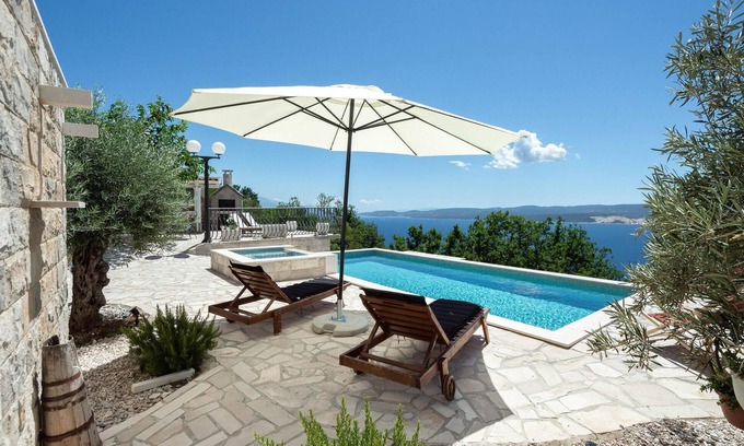 This holiday home with pool is located on the slopes of Dinara Mountain, in the heart of Dalmatia and not far from Split. The rustic and modern furnished holiday accommodation consists of two residential units and offers you everything you need for a pleasant stay. Enjoy the marvellous view of the open sea, the large terrace with pool for your refreshment and the whirlpool where you can relax. The ground floor with its modern, well-equipped kitchen, dining and living area is the zone for socialising. The sleeping area is located on the upper floors.