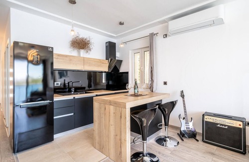 Spend your holiday in this holiday home with pool in a quiet bay of Pjetata. This holiday home offers you everything you need for a perfect stay. On the ground floor you will find the bedroom, leisure room with table football, darts and TV, bathroom and living room with kitchen. From the living room, you can access the terrace with a marvellous panoramic view of the sea and the refreshing pool. On the first floor, which is accessible via external stairs, there are two bedrooms, three bathrooms, a toilet, fitness room and kitchen with living room. You can switch off in the sauna and give your body and mind some well-deserved relaxation. As soon as the sun goes down, you can prepare delicious meals on the beautiful outdoor barbecue and enjoy convivial moments. However, the main feature of this accommodation is the front row to the sea, which allows you to sunbathe, swim or use a kayak on the small concrete beach below you at any time. The landlord offers transfer/vehicle hire at an extra charge.