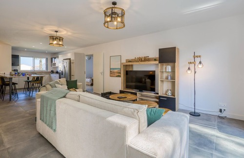This spacious, ground-floor residence welcomes you with bright and tastefully furnished rooms that offer you a comfortable base for an eventful holiday with your loved ones. Conjure up your favourite dishes using fresh ingredients from the market and plan your activities together at the large dining table. Snuggle up on the cosy sofas in the evening, play a board game or devote yourself to quiet hours of reading.