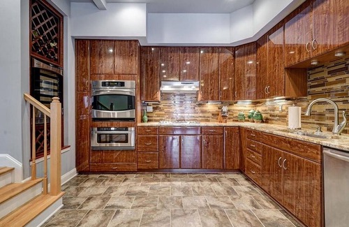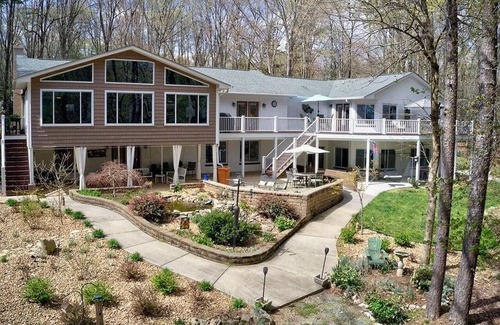 Beautiful 6200+ sq foot home located on two lots in the upscale Merifield Acres development in Virginia's only lakeside town. Room for one or more families/groups with two gourmet kitchens, beautiful sun room with a lake view, HUGE master suite, second master suite, two additional bedrooms (including a bunk room for the kids), media room, private office for those looking for a WFH vacation, high-speed wireless internet, cable TV, home gym, and rec room with shuffleboard and a pool table. Property also has a private covered boat dock, two grills - one on expansive upstairs balcony and one downstairs, and an outdoor oasis featured in Southern Living, Better Homes and Garden and more. For your added enjoyment, you are provided one pedal boat, one canoe, two inflatable stand up paddleboards, and life jackets (several universal and a few that are size-specific).