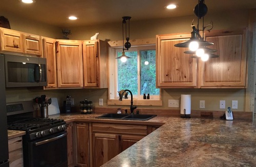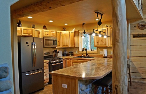 Imagine watching the Moose stroll by from the comfort and privacy of your own large wraparound porch. Wake up to nothing but the sounds of nature and the beating of your own heart. This gorgeous home has 2 bedrooms, 1 bath. The large bathroom has full laundry facilities with new LG HE Washer and Dryer. The King Loft suite affords views but with the privacy of blackout curtains and cellular shades and has a TV with Roku. Upstairs is also an office area for privacy to conduct business, read or just catch up on your emails. There is a superb kitchen with full size appliances, a large great room with gorgeous ceramic wood stove, radiant in-floor heating. free nationwide telephone calls on us. Grill your catch of the day out on the porch on the BBQ Grill, relax on the Adirondack Chairs sipping a glass of wine or hot cocoa. The cabin sits on an extremely private 1.5 acres of wooded beauty. Located in a private lake community and only a few minutes stroll to the lake where you can fish, swim or just relax by the water's edge. The cabin sleeps 6 comfortably.