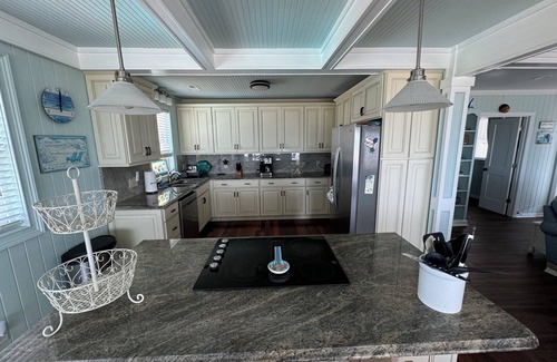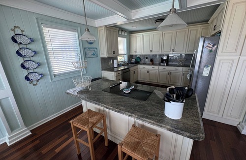 The living room and kitchen provide an awesome oceanfront view of the Atlantic ocean! The renovated gourmet kitchen is equipped with state of the art appliances and is perfect for preparing large family dinners and seafood feasts! The living room is fully equipped with a 65' flat screen TV, HD digital cable, a DVD player, & family games!