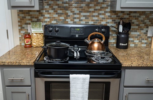Kitchen: Fully stocked kitchen is great for meal preparation, complete with appliances, electric stove, refrigerator/freezer, garbage disposal, toaster, blender, electric kettle and coffee maker. All needed cooking and dining ware is included.