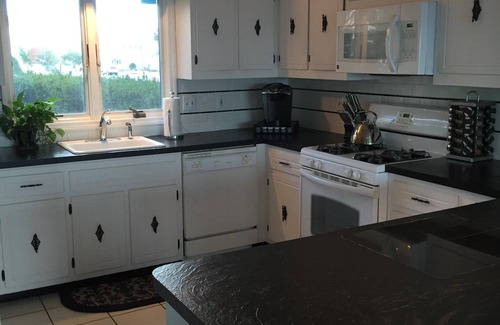 Downstairs was designed with an open floor plan: dining room (gas fireplace), outfitted kitchen (Keurig, Cuisinart, etc.), living room (55' screen, DVD, Blu-Ray), 1/2 bath, and laundry room (exit to outdoor shower).