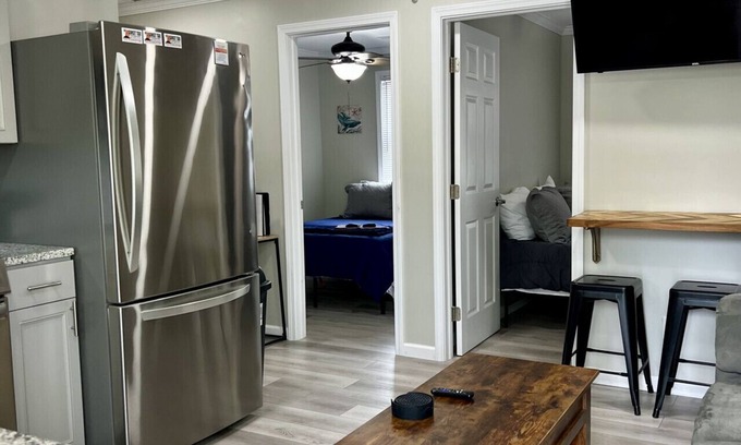 Living room: Sleeper sofa | Linens | Hulu Live Smart TV | Bar seating for 4