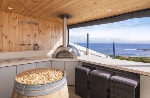 The outdoor spaces are just as impressive, with expansive double-level deck offering 180-degree views of the coastline. The alfresco area is perfect for small social gatherings overlooking the bay, equipped with a wood-fired pizza oven and a gas BBQ, providing plenty of space for family meals or casual dining while enjoying the fresh sea air and spectacular scenery. Once the sun sets, the view of the stars as you relax in the hammock on the deck can only be described as magical.