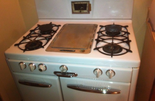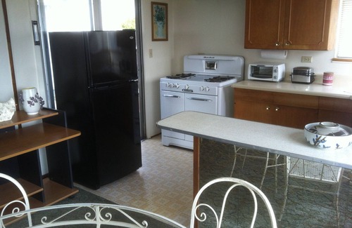 Unlike staying at a hotel, you will have a full kitchen, small-full-sized refrigerator, and full-sized stove (experience the spotless '50s-vintage O'Keefe & Meritt-including full-sized oven, broiler, even a built-in griddle for your homemade pancakes! They don't make 'em like this anymore...), microwave, dining table for four, with view.