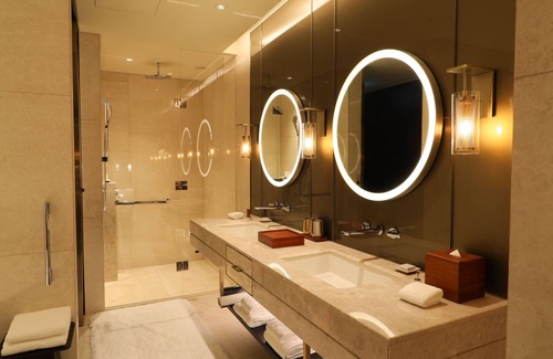 Grand Hyatt Jeju offers 1600 accommodations with minibars and safes. Beds feature premium bedding. 75-inch Smart televisions come with digital channels and Netflix. Bathrooms include separate bathtubs and showers with rainfall showerheads, bathrobes, slippers, and bidets.
