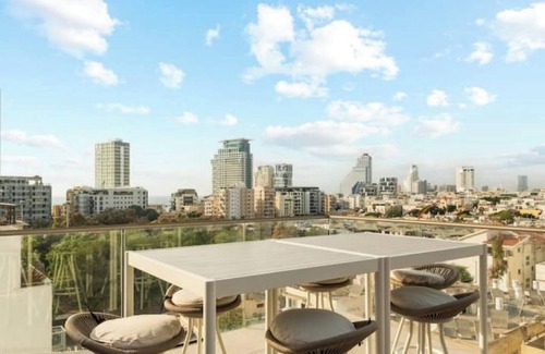 Two-level luxury penthouse in Tel Aviv with panoramic Mediterranean & skyline views. 4 bedrooms (3 master suites + safe room), smart home, fully equipped kitchen, 90” TV lounge, and huge rooftop terrace with seating, BBQ, and ice bath. Private parking included. Perfect for families & groups, up to 12 guests. Fast WiFi, premium bedding, and top comfort.