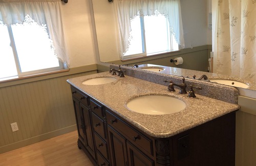We have a fully stocked kitchen with everything you need and plenty of space to prepare meals during your stay. The house also has a bonus room with a ping pong table for indoor fun.