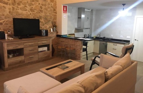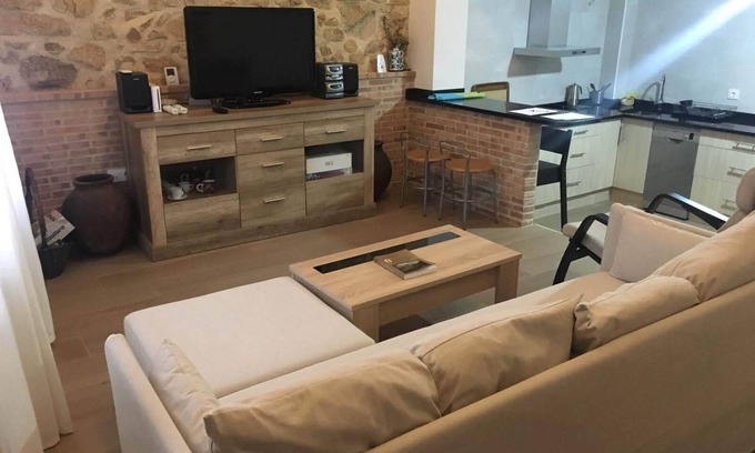 Living room equipped with air conditioning cold / heat, sofa bed, rocking chair, TV, dresser, stereo, board games, bar to kitchen, fully equipped kitchen with utensils, plates, saucepans, pot, juicer, pans, glasses, coffee maker, everything you need to cook, dishwasher, oven-microwave, fridge-freezer, induction hob, tablecloths, kitchen cloths, apron, 2 kitchen tables, stools.